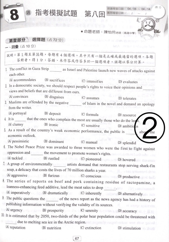 105å¸å¹´åº¦å¤§å¸æè è±æç§' å°åå¸è£æå"æè§£ç" æäº ç¶²æ¨ from images.chinatimes.com 看完這麼多英文指考秘訣,相信大家對於該如何準備都已經有自己的想法了,雖然這樣一串看下來要準備的事情很多,但其實距離指考時間也還有五個月,這段時間內只要按部就班,審視自己身不足並進一步加強,相信大家都能考到一個自己理想的成績。 筆者當年也是拼到指考才上了自己想上的大學,很明白大家看著考上的同學開心玩耍,自己卻還在埋頭苦讀的鬱悶心情。 但請記得,一定要相信自己的努力跟付出,都是有意義的。 不要輕言放棄,相信自己一定能夠做到,就是通過考驗的不二法門喔!! 除了學測指考教材外,多益、托福、雅思、全民英檢,常見英檢定教材皆收錄在商城中,快點擊連結去逛逛吧! See full list on blog.wordup.com.tw 16 hours ago · 大學指考今第二天登場,是最多考生上戰場的一天。大考中心統計,英文科有4萬760人報名,人數居指考各科之冠,其次是4萬. Jul 02, 2019 · 108年大學指考英文科試題與參考解答(含非選),由台北市補習教育事業協會提供,大學指考第一日考物理、化學、生物;第二日考數乙、國文、英文. See full list on blog.wordup.com.tw Jul 06, 2019 · 指考英文 常常是大家最頭痛的科目之一,單字背多少才算夠?文法到底要讀到多難?英文作文怎麼寫才能拿到高分.?這些都是大家常常會問的問題,今天,我們將從一個考試導向的方式進行切入,告訴你 指考英文 究竟該怎麼準備,讓你用最短的時間、最有效率的方式來準備指考英文。 17 hours ago · (中央社記者許秩維台北29日電)今天是大學指考第2天考試,英文試題取材廣泛且生活化,中譯英主題為全球暖化,英文作文則考大學鼓勵教授以. See full list on blog.wordup.com.tw